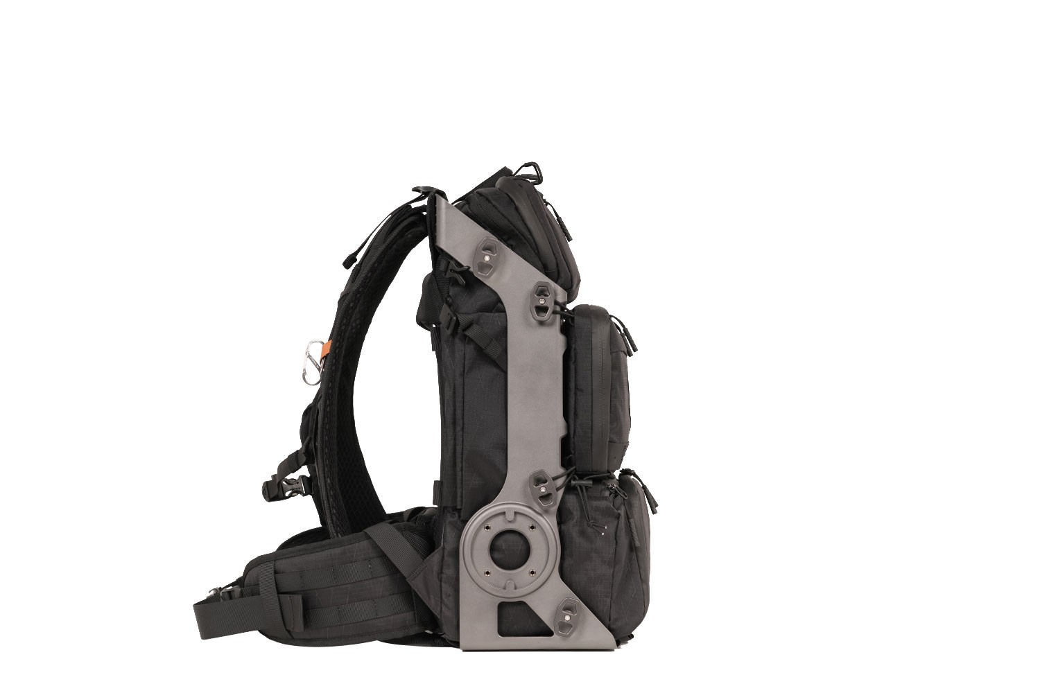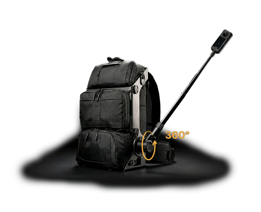 バックパック全体が安定した支持フレームとなり、撮影アームや外付け機材をしっかり固定できます。ポータブル電源、ソーラーパネル、スケートボード、テント、釣り竿などの装着にも対応します。